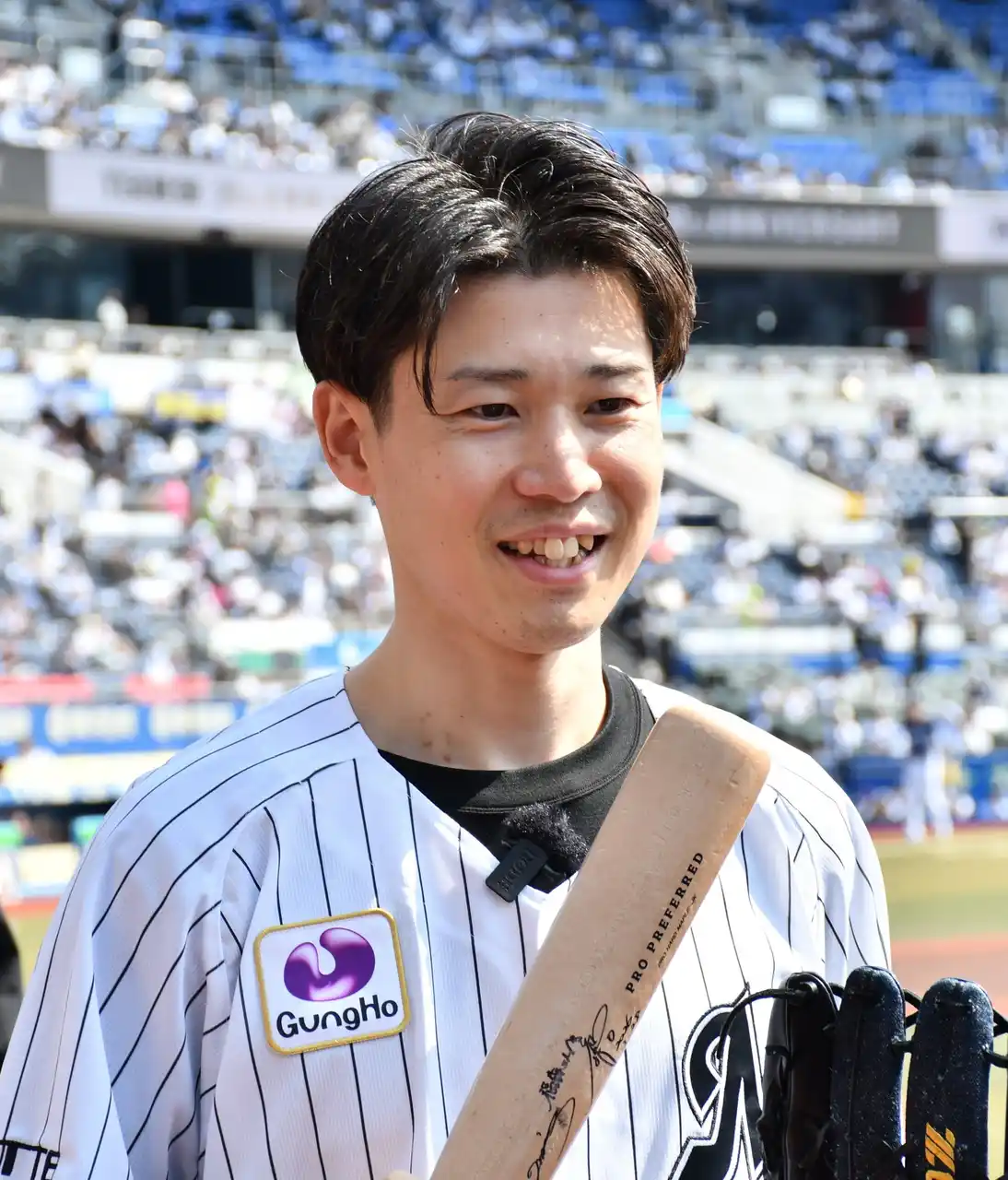 高部瑛斗選手からバットを受け取る福森さん |