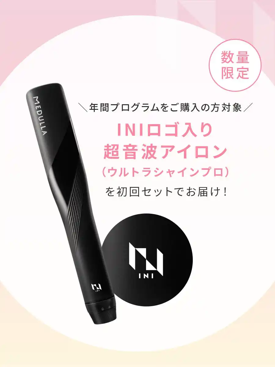 本CM公開にあわせて、MEDULLAでは期間限定の特別キャンペーンを実施いたします。期間中、対象商品をご購入いただいた方に向けて、通常価格から最大約93%OFFとなる特別プランをご用意。さらに、購入者限定でノベルティ特典も提供いたします。また、INIとのコラボレーションを記念し、数量限定でINIロゴ入り超音波アイロンが付属する特別セットも展開予定です。本キャンペーンは、スマートフォンから簡単に受けられる髪質診断を通じて、一人ひとりに最適なヘアケアを体験いただく機会として実施されます。 |