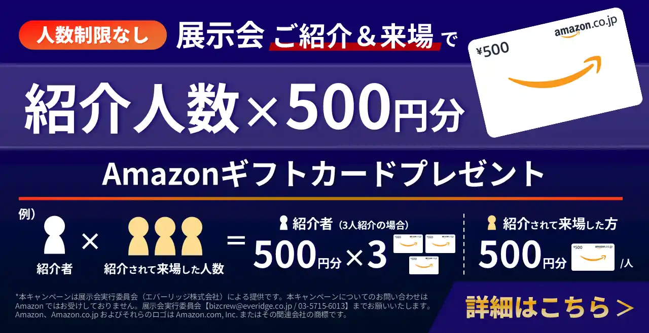 | 本キャンペーンは展示会実行委員会(エバーリッジ株式会社)による提供です。本キャンペーンについてのお問い合わせは Amazon ではお受けしておりません。展示会実行委員会【bizcrew@everidge.co.jp / 03-5715-6013】までお願いいたします。Amazon、Amazon.co.jp およびそれらのロゴは Amazon.com, Inc. またはその関連会社の商標です。 | |||