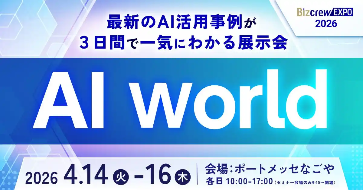 ---<展示会概要>------------------------------------------------------- AI World 2026 春 名古屋 展示会HP:https://www.bizcrew.jp/expo/ai-nagoya 会 期:2026年4月14日(火)~4月16日(木) 10時~17時 会 場:ポートメッセなごや 主 催:DX 総合EXPO/ビジネスイノベーション Japan/AI World 実行委員会 後 援:(一社)日本デジタルトランスフォーメーション推進協会、 (一社)日本テレワーク協会、(一社)AI・IoT普及推進協会 |