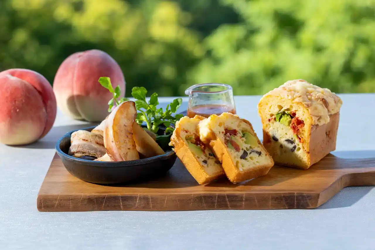 | アボカドとトマトのケークサレ 桃とベーコンのグリル スウィートビネガー桃 | |||||||||