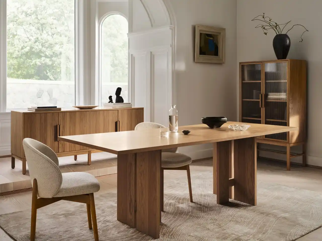 axoコレクションは、統一感のあるダイニングのあり方を提案しています。テーブルに加え、サイドボードやガラス扉のキャビネットを展開、ダイニングとリビングを自然につなぐ、柔軟な空間づくりを可能にしています。キャビネットに用いられた、波打つようなフロストガラスは、静かな個性を添えるディテールです。 |