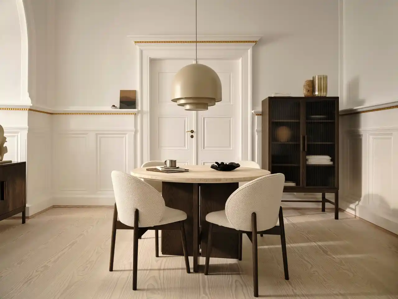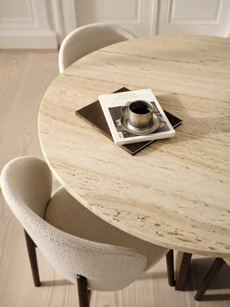 ナチュラルオークおよびダークオークべニアを用いて仕上げられ、木そのものの触感や奥行きのある表情が豊かに表現されています。また、コレクションの象徴的な存在であるトラバーチンのラウンドダイニングテーブルは、天然の石目によって、一点一点が異なる表情を持つ、唯一無二の存在です。 |