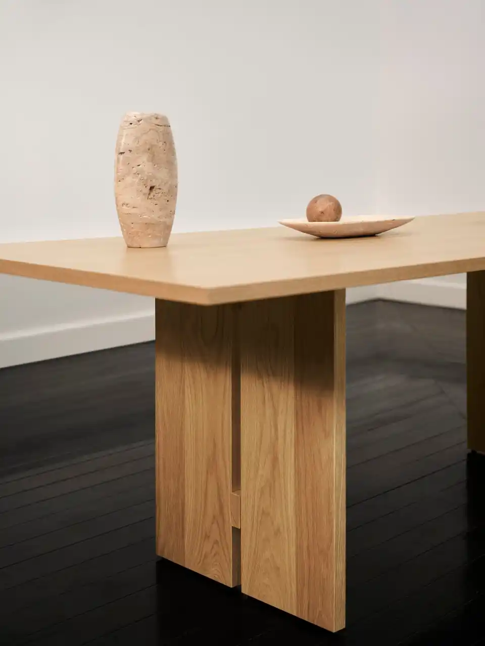 「オークもトラバーチンも“生きている素材”です」とローゼは語ります。 「使い込むほどに美しくエイジングしてゆく、それこそが、家具に“真の個性”を与えるものだと思います。」 |