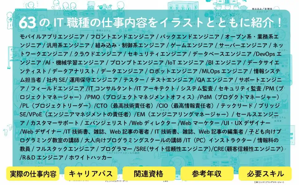| 続く「IT職種」パートである2~12章では、エンジニアをはじめとしたIT業界で活躍するさまざまな職種について、実際の仕事内容をイラストとともに紹介。それぞれの仕事の違いや役割がひと目でわかり、自分に合った職種やキャリアの方向性を考えるヒントが得られます。さらに、各章末にはIT業界の疑問を解消するコラムや、 現場ではたらく人へのインタビュー「お仕事を教えてもらおう」ページでリアルなIT業界でのはたらき方を知ることができる内容になっています。巻末付録としてIT関連資格の一覧と解説も掲載し、学習やキャリア形成に役立ちます。 | ||||||||||||||||||||||||