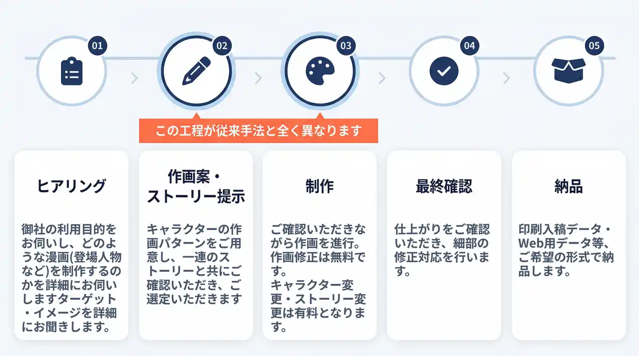 従来の漫画制作工程を大幅に短縮し、最短5営業日で初稿提出が可能です。 お急ぎの展示会用パネルや、スケジュールの限られたプロモーション案件など、短納期が求められる場面にも柔軟に対応します。 |