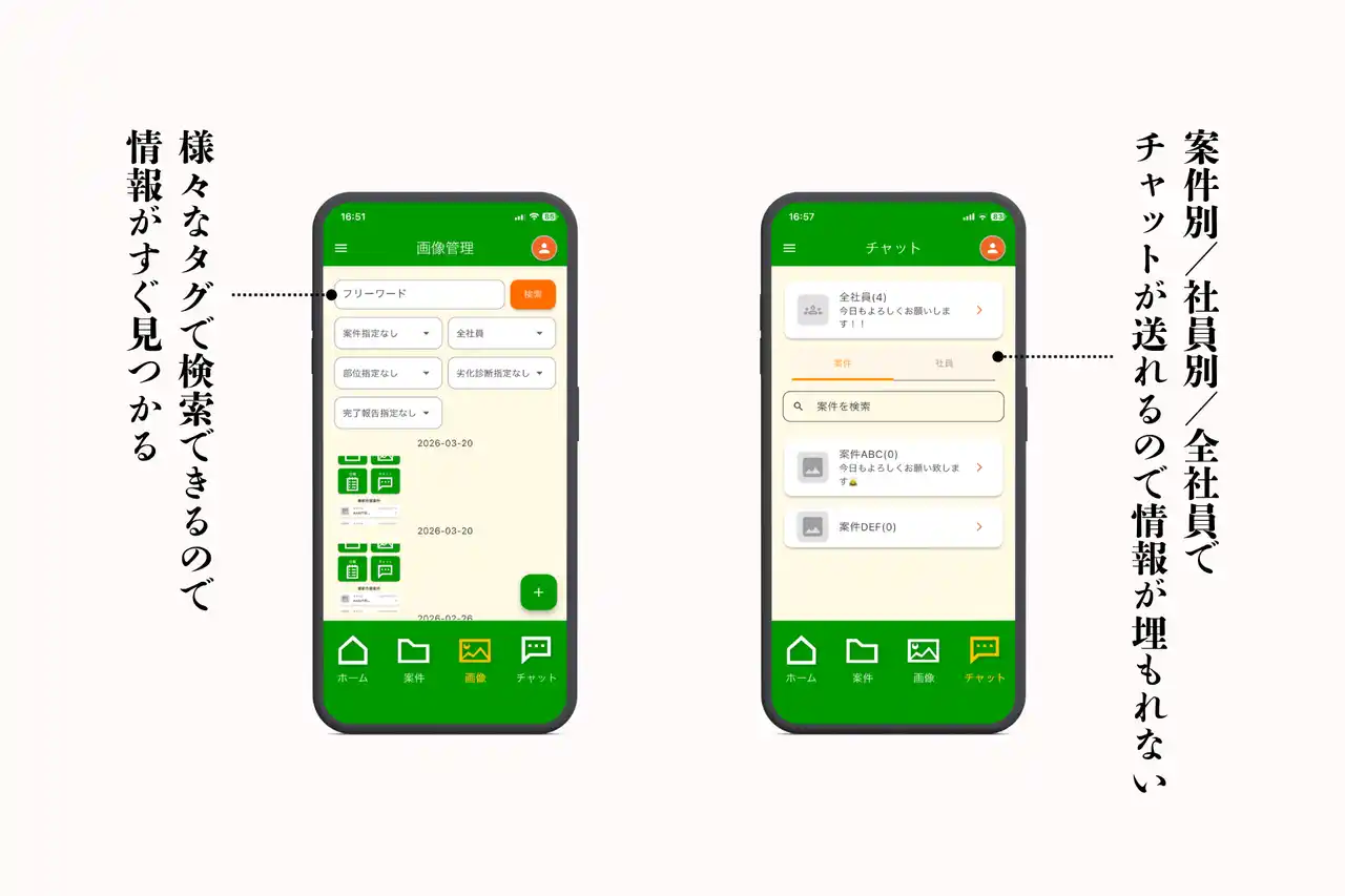 「ヌリスマ」は効率可能な事務作業を短縮化するため、案件ごとに情報を集約する「情報の箱」機能を搭載しました。チャット、写真、現場の進捗状況を一つの画面で管理することで、情報の検索や整理の手間をゼロに。情報管理と書類作成を限りなくシンプルにすることで、業界全体の生産性向上に貢献します。 |