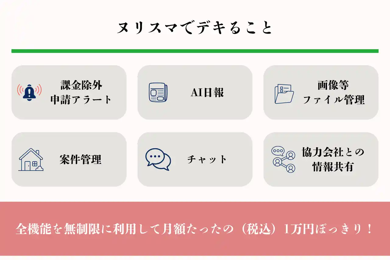 主要ポータル4社(ヌリカエ、リショップナビ、外壁塗装の窓口、ヌリマッチ)からのメールを自動読み込み&自動登録 。申請期限が近づくとヌリスマが自動でアラートを通知します 。この「課金除外申請アラート機能」は現場管理アプリ業界で唯一無二の機能。月に1件でも課金除外申請漏れを防ぐことができれば、2万円弱の無駄なコストの削減に繋がります。つまりヌリスマの月額費用の税込1万円(日当たり323円)は回収可能です 。コストではなく「利益を守る」ための投資を、今すぐ始めましょう。 |