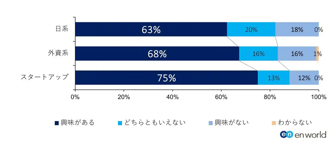 *本調査において、企業タイプは「日系」「外資系」「スタートアップ」としています。スタートアップは、日系・外資系問わず事業フェーズが「立ち上げ期・急成長フェーズ(スタートアップ)」と回答した企業とし、「成熟・安定フェーズ」と回答し、かつ日系・外資系いずれかを選択した企業を日系・外資系に分類しています。 |