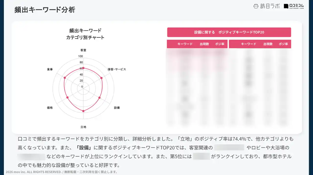 口コミに頻出するキーワードをカテゴリ別に分類し、詳しく分析しました。 |
