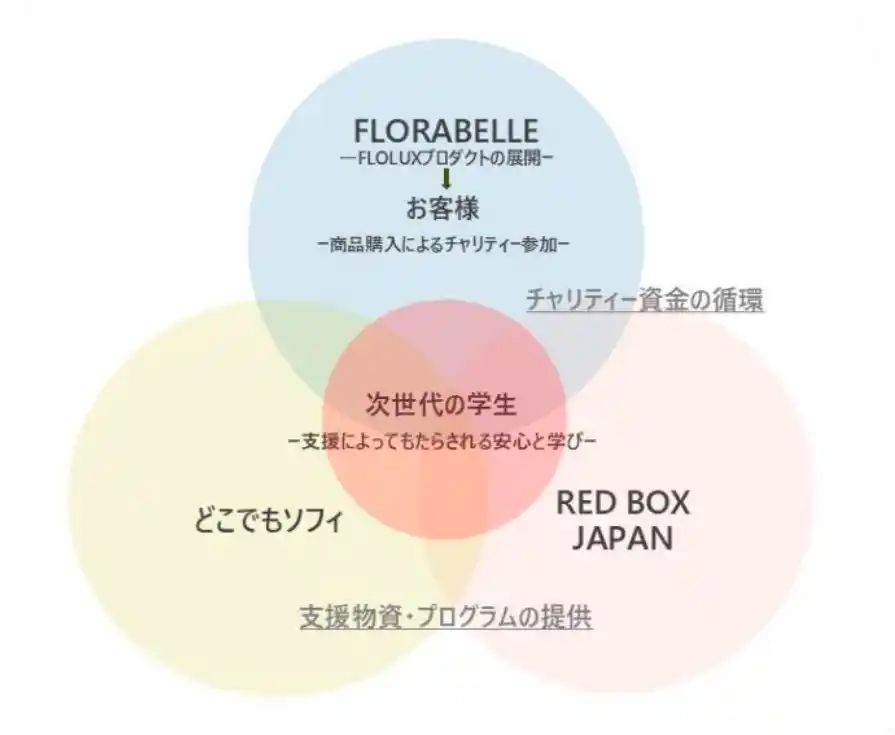 本プロジェクトは、FLOLUXのプロダクトを通じ、レッドボックスジャパンとユニ・チャーム「どこでもソフィ」の取り組みと連携し、それぞれの強みを活かした持続可能な支援の形を目指します。 |