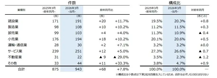 | 業種別にみると、7業種中6業種で前年を上回った。『サービス業』(前年同月239件→251件、5.0%増)が最も多く、2025年7月(263件)に次ぎ2000年以降で過去2番目に多かった。『小売業』(同176件→194件、10.2%増)は3カ月連続で前年を上回った。『建設業』(同171件→191件、11.7%増)は前年を上回り、2025年度で最多となった。『製造業』(同98件→108件、10.2%増)は2カ月ぶりに前年を上回り、3月としては過去10年で最も多かった。 | |||||||||