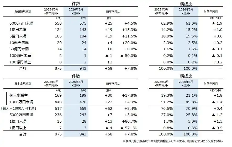 | 負債額を規模別にみると、「5000万円未満」が575件(前年同月550件、4.5%増)と7カ月連続で前年を上回り、3月としては2000年以降で最多となった。「5000万円以上1億円未満」は143件(同124件、15.3%増)と、4カ月連続で前年を上回った。 | |||||||||