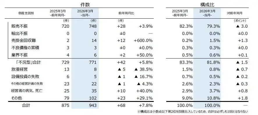| 主因別にみると、「販売不振」が748件(前年同月720件、3.9%増)で、3カ月連続で前年を上回り、3月としては過去10年で最も多かった。この他、過去10年で最多となった「売掛金回収難」(前年同月2件→14件、600.0%増)などを含めた『不況型倒産』は771件(同729件、5.8%増)となり、全体の81.8%を占め、3カ月連続で前年を上回った。 | |||||||||