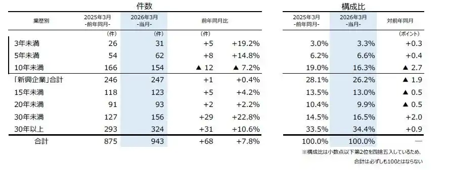 | 業歴別にみると、「30年以上」が324件(前年同月293件、10.6%増)で最も多く、2カ月連続で前年を上回り、3月としては過去10年で最多となった。次いで「30年未満」は156件(同127件、22.8%増)と、4カ月連続で前年を上回り、3月としては過去10年で最多となった。 | |||||||||