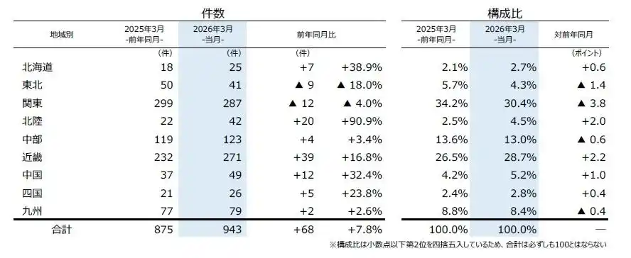 | 増減率でみると、『北陸』(前年同月22件→42件、90.9%増)がほぼ倍増となり、3月としては2000年以降で2番目に多かった。特に「新潟」(同8件→15件)や「石川」(同3件→12件)が全体を押し上げた。 | |||||||||