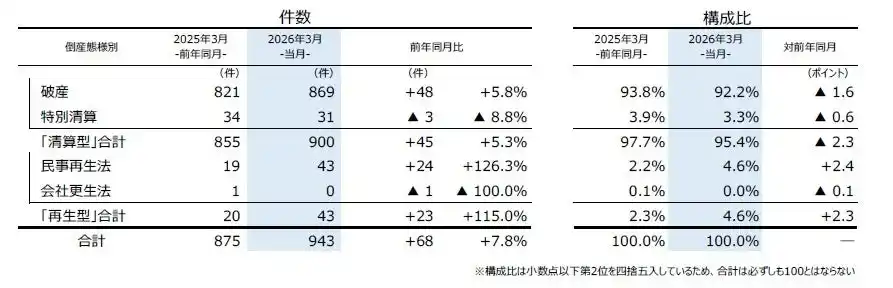 | 態様別にみると、『清算型』倒産は900件(前年同月855件、5.3%増)となり4カ月連続で前年を上回った。『再生型』倒産は43件(同20件、115.0%増)発生し、3月としては2012年(54件)以来14年ぶりに40件を超えた。 | |||||||||