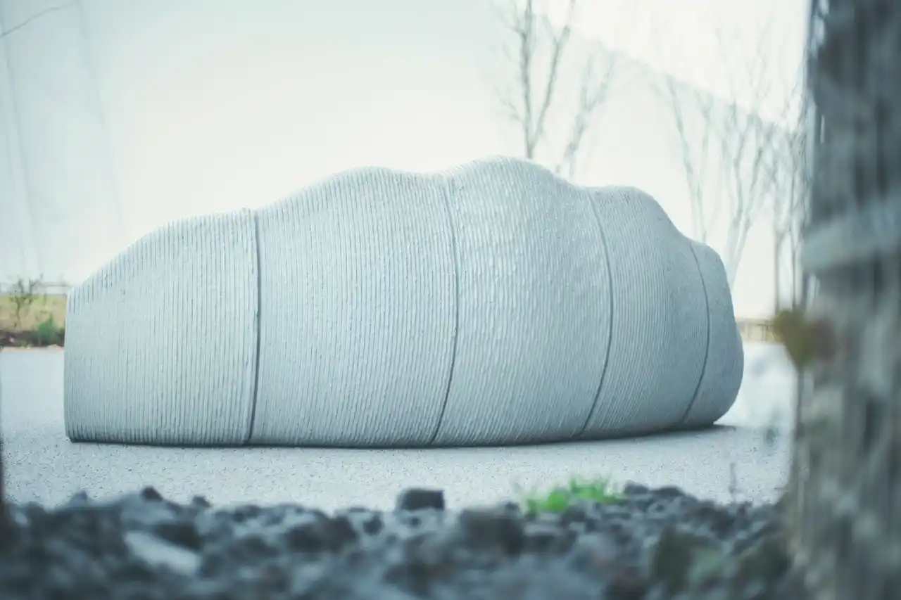 「HOTABENCH(ホタベンチ)」は、約1,000枚(40kg)もの廃棄貝殻を砂の代替素材として再利用し、型枠不要の3Dプリント技術を用いることで、従来のコンクリート製ベンチに比べ約300kgのCO2削減を実現したサステナブルなプロダクトであり、バイオミミクリーに基づきホタテの構造を模倣した特殊なリブ形状や、あえて表面に残した積層痕によって自然が生み出した資源循環を美しく体現しています。 |