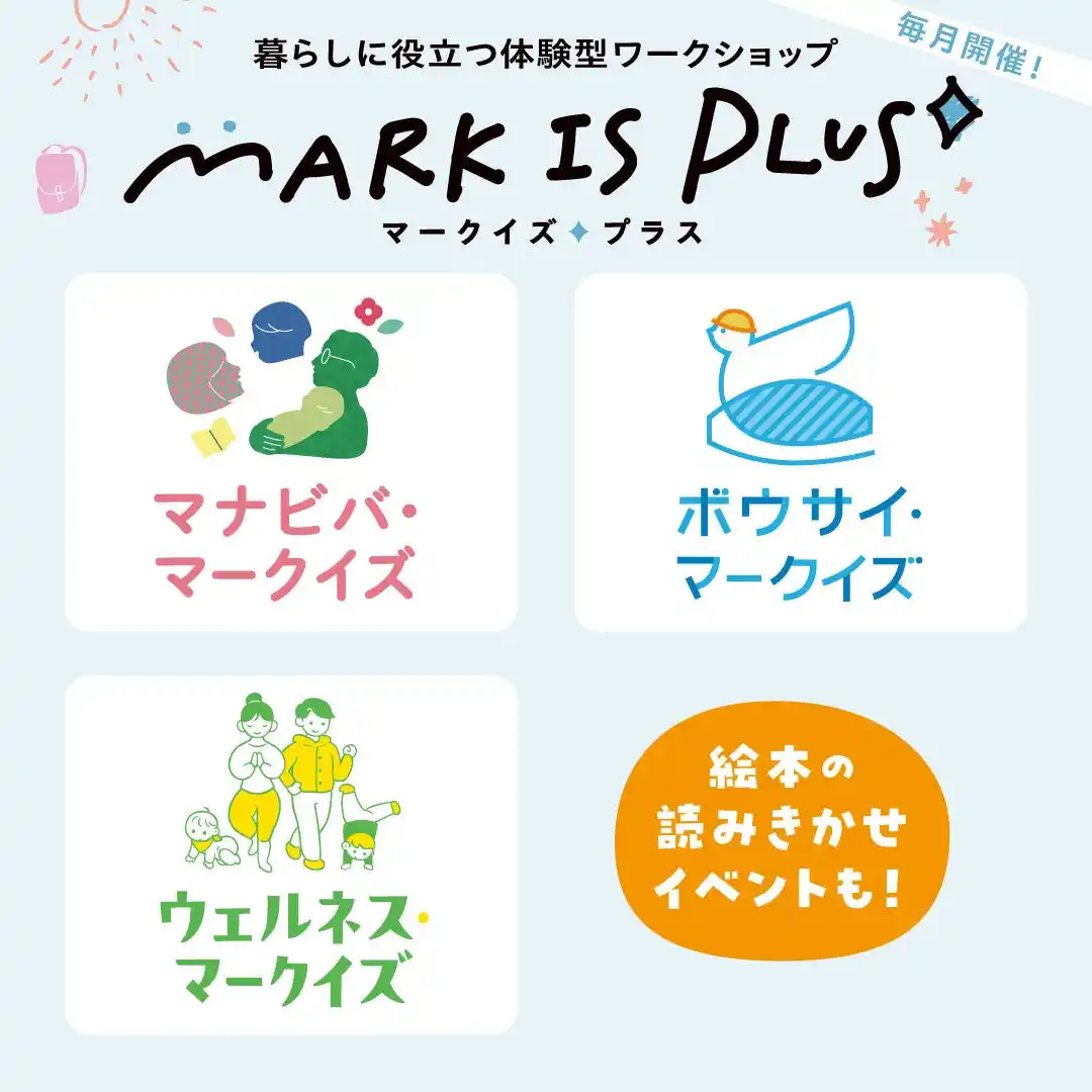 昨年度に開始した地域連携イベント「マナビバ・マークイズ」「ボウサイ・マークイズ」を統合し、「マークイズプラス」としてバージョンアップ。地域のお客様との接点づくりの場として、今年度も毎月開催します。 |