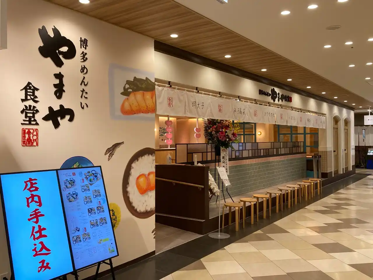 2025年6月オープン。3階「博多めんたいやまや食堂」では、九州の味覚を定食で楽しめ、炊きたてご飯、明太子、からし高菜が |