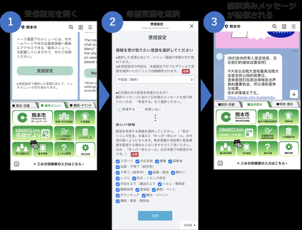 熊本市LINE公式アカウントを友だち追加すると、各言語で受信設定の回答を促すメッセージが表示されます。利用者は、情報を受け取りたい言語を登録すると、希望の言語に翻訳されたメッセージを受信できます。併せて、日本語原文の配信を希望すると、翻訳済みメッセージと日本語のメッセージのどちらも受け取ることが可能です。 |