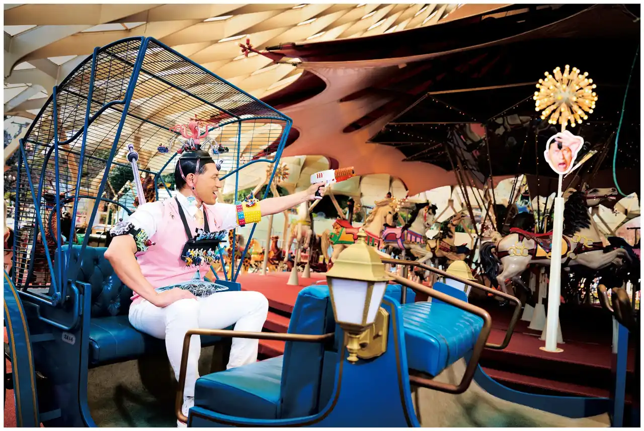 新アトラクション「シューティング遊園地」は、園内各所にある「西武園ゆうえんちの化身」となった春日さんの顔の的を赤外線銃で狙います。アトラクションに乗りながら撃つ!動いているアトラクションを撃つ!!新しい体験型アトラクションの登場です。