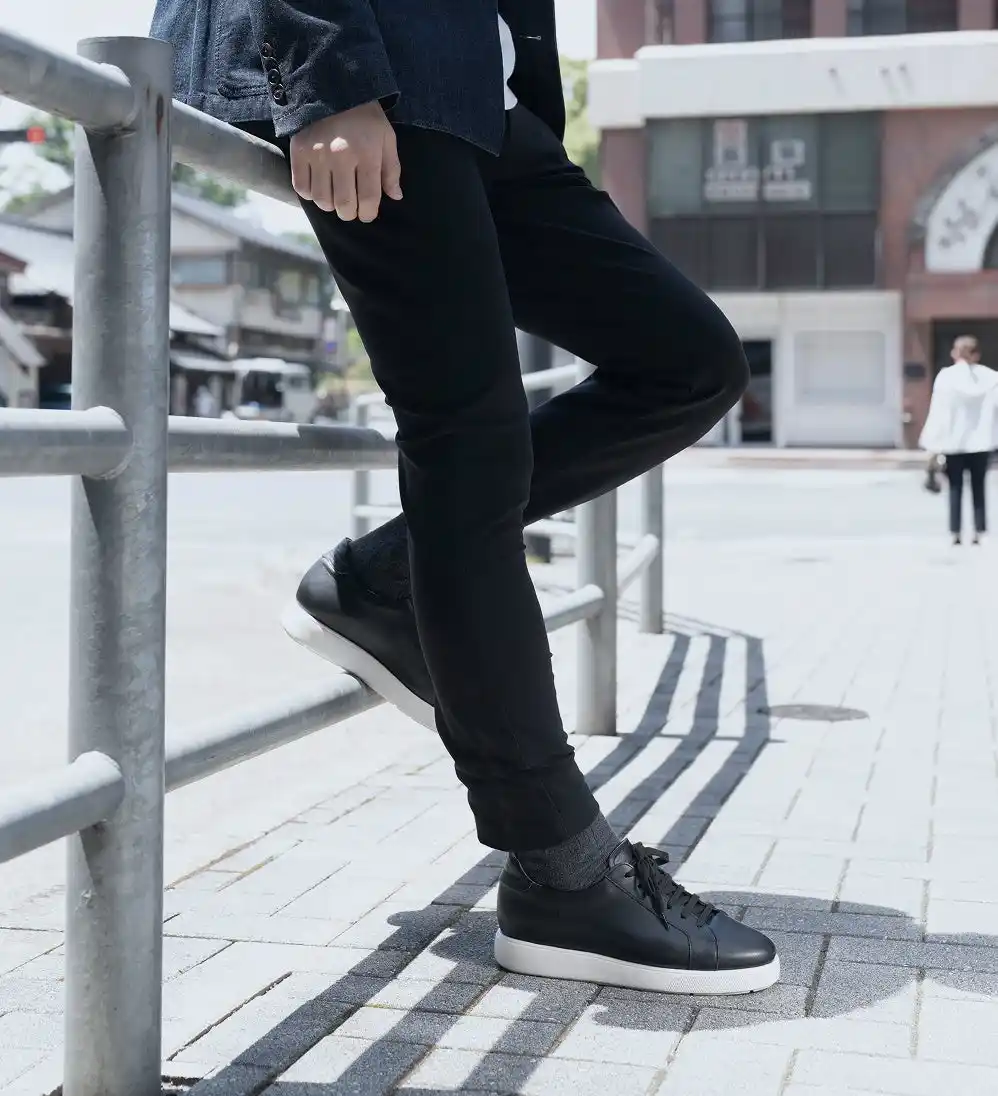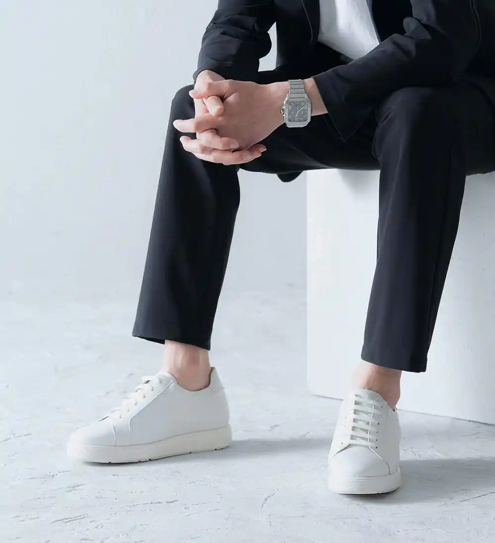 内部構造により、かかとの位置を適度に引き上げ、脚のラインを美しく補正。視線が自然と上がり、全身のシルエットがすっきりと見えるよう設計されています。スーツやデニムなどで、パンツの裾がもたつかず、バランスの取れた印象に整います。また、靴底は厚みを抑えた設計で、一般的なスニーカーと変わらない見た目に仕上げています。 |