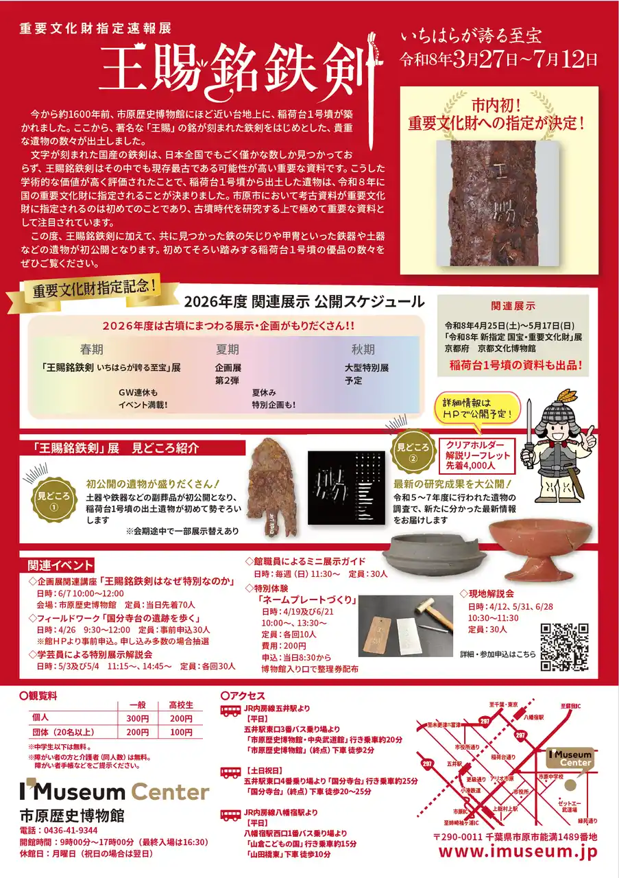| 市原歴史博物館で、国指定重要文化財に指定されることが決定した王賜銘鉄剣を中心に、稲荷台1号墳出土遺物をお披露目展示する速報展を開催しています。 | |||||||||||||