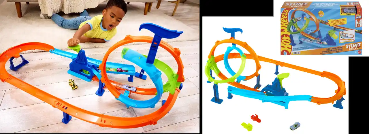 1968年に誕生したホットウィールの定番ラインで、実車モデルから独自デザインのオリジナルカーまで、年間約400種類の幅広いラインアップを展開しており、毎月第一土曜日に発売がされています。これら多彩なミニカーを新商品の「サイクロンクラッシュ」はもちろん、その他プレイセットと共に遊ぶことができます。 |