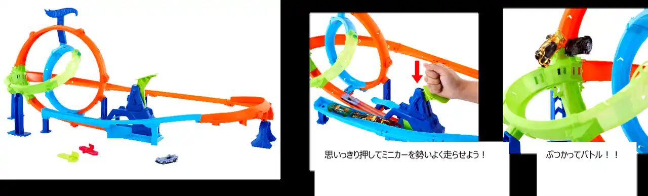 サイクロンクラッシュについている押し手を思いっきり押すことで、ダブルループの上に、ホットウィールのミニカーを勢いよく走らせて遊ぶことができます。2つの交差するダブルループを次々と走らせ、クラッシュゾーンを回避しましょう。最大4台のミニカーを同時に走らせることができ、自分で遊ぶのはもちろん友達とも一緒に競いあって遊ぶことができます。ホットウィール ミニカーが1台同梱されています。 |