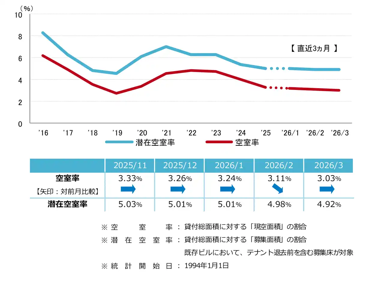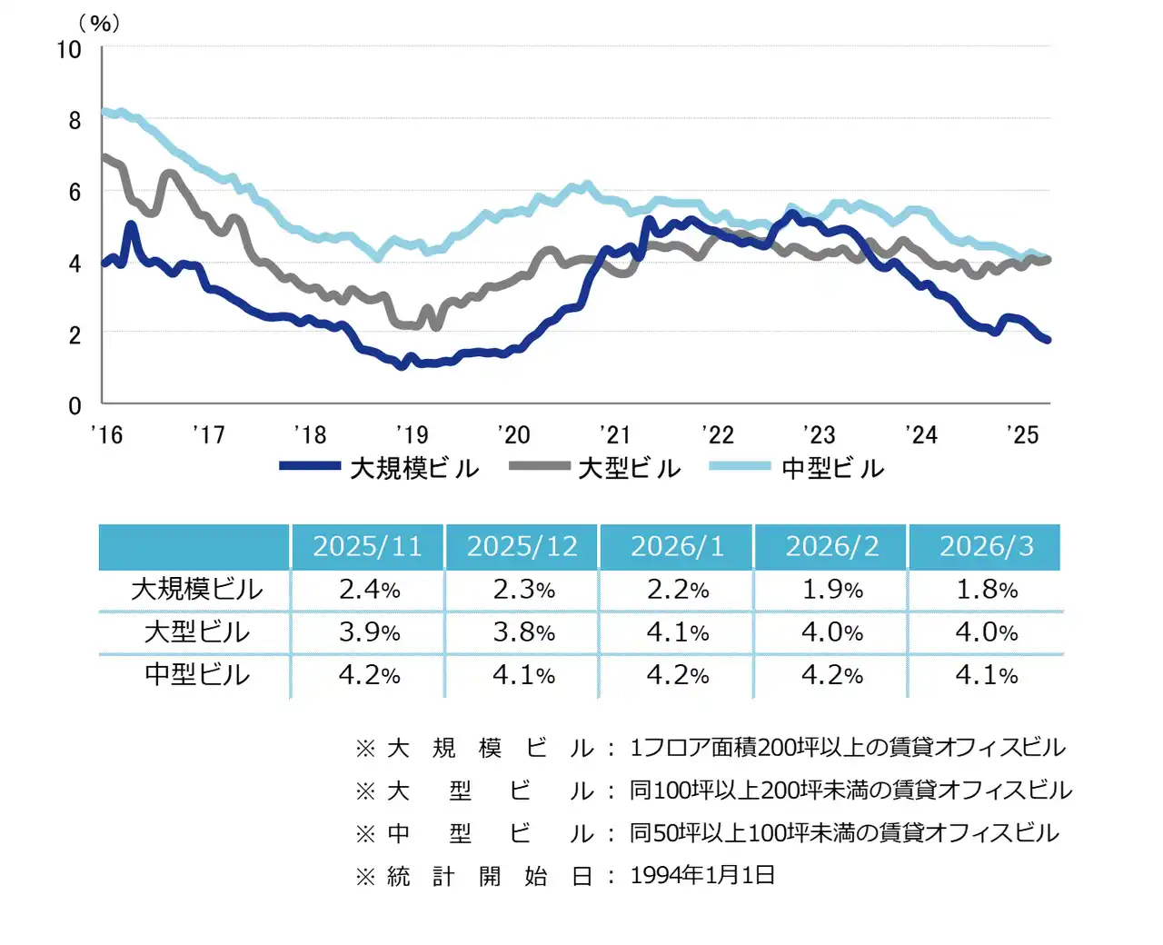 オフィス需要は活発な状況が続く一方、主要エリアの新築・築浅ビルでは一段と品薄感が強まっている。 |