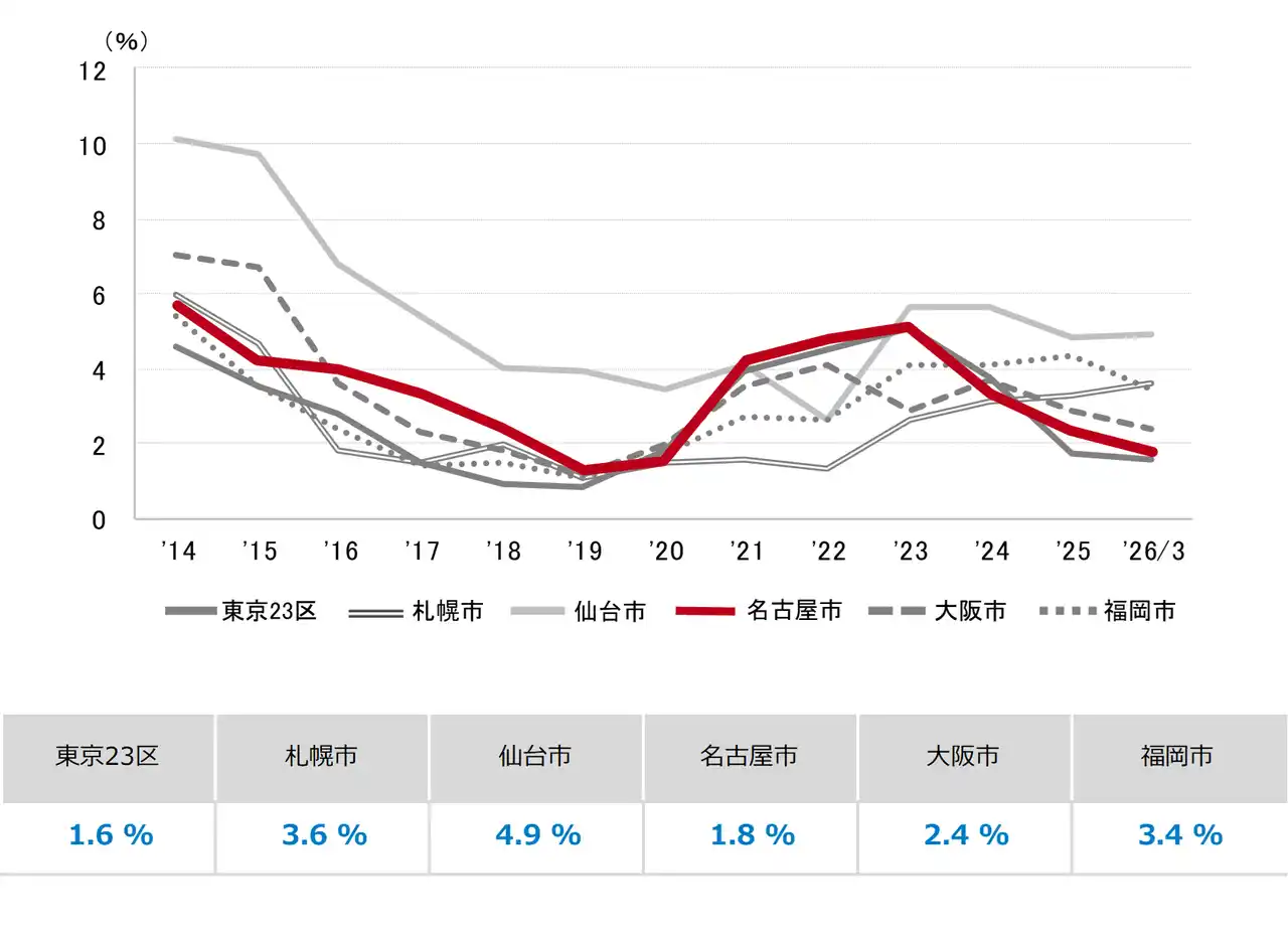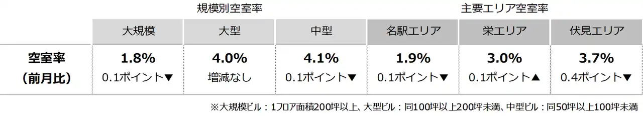 三幸エステート株式会社(本社:東京都中央区、取締役社長:福島正二郎)は、2026年3月度の名古屋市オフィス賃貸状況(空室率&現空面積:全規模、募集賃料&募集面積:全規模、規模別空室率、主要エリア※1空室率:全規模)および全国6大都市(東京・札幌・仙台・名古屋・大阪・福岡)の大規模ビルのマーケットデータをまとめた「オフィスマーケット2026年4月号名古屋」を公表します。 |