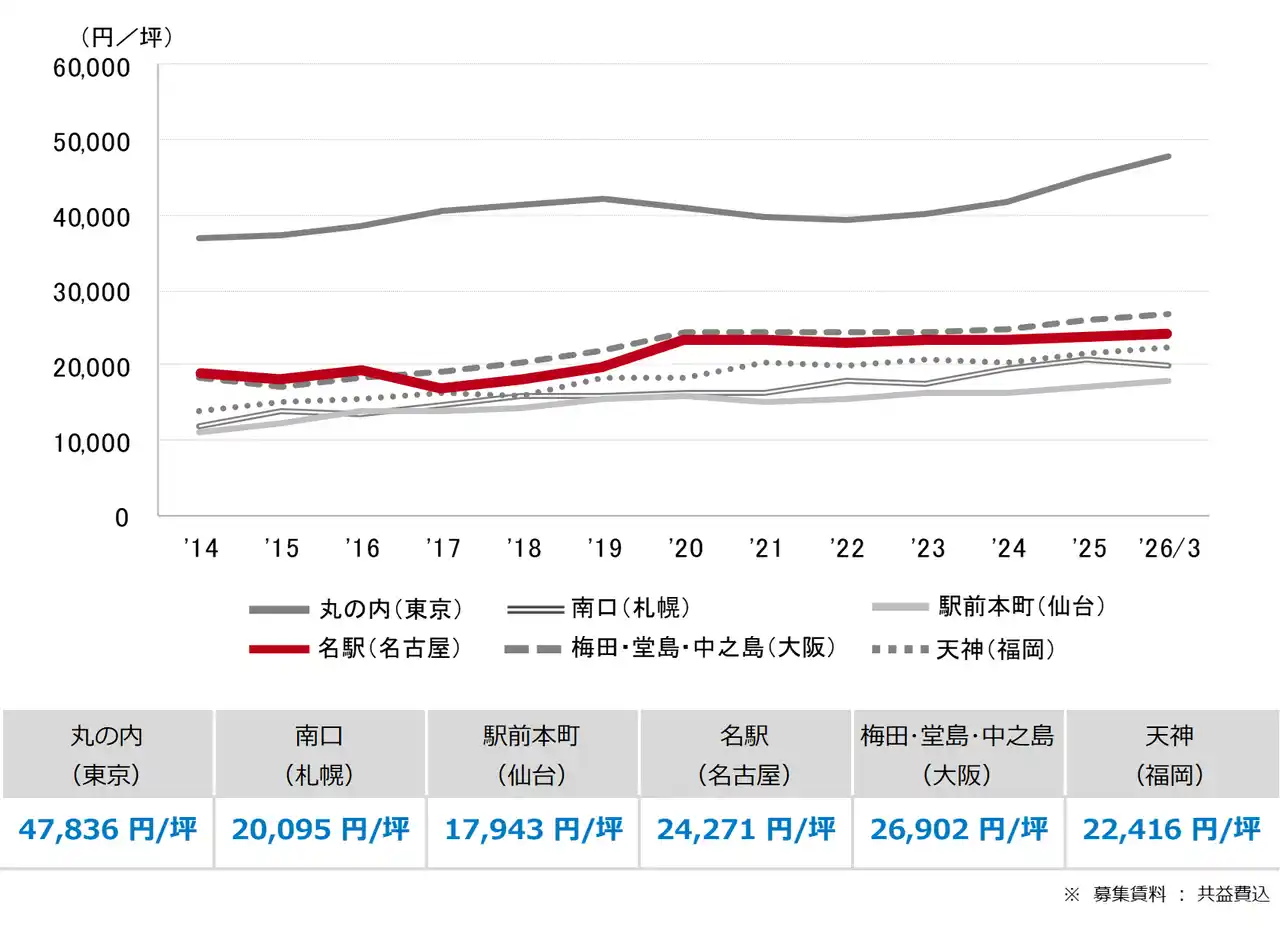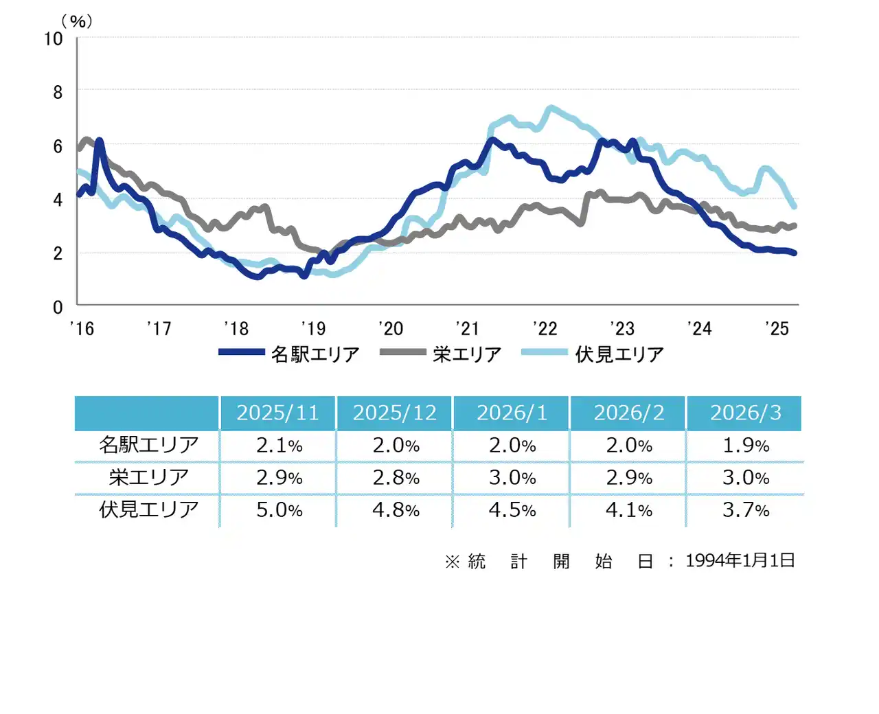 2026年第1四半期は今年の供給量のピークとなっており、3月には「ザ・ランドマーク名古屋栄」「栄トリッドスクエア」の2棟の大規模ビルが竣工した。今年は更に3棟の大規模ビルが竣工を控えているが、概ね順調にテナント誘致が進んでいる。竣工まで1年以上ある2027年竣工予定の建築中ビルにおいてもテナントの内定が進み、需要の先取りが見られる。(名古屋支店長 妹尾哲也) |
