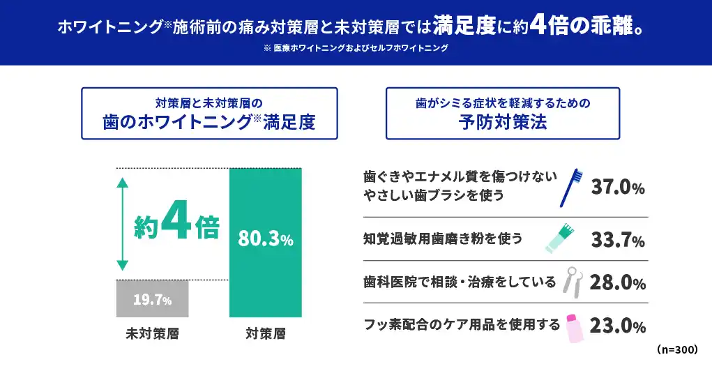 歯のホワイトニング※の満足度を左右するのは「シミる症状への予防対策」が鍵。予防対策をしている層の満足度は80.3%に達し、未対策層の19.7%と比較して約4倍の乖離。