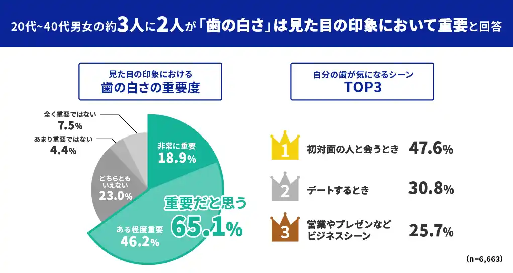 | 本調査は、2026年2月に首都圏在住の20代~40代男女6,663名を対象に実施しました。「歯の見た目に関する意識」について聞くと、全体の65.1%が「歯の白さ」が見た目の印象を左右すると回答。加えて全体の約半数が「初対面の人と会うとき」に自身の歯が気になると回答しており、次いで「デートするとき」・「営業やプレゼンなどビジネスシーン」が続き、第一印象が重視されるビジネスや対人関係において、「歯の見た目」を整えることがセルフケアの一つとして重要視されている実態が伺えます。 | ||||||||||||||