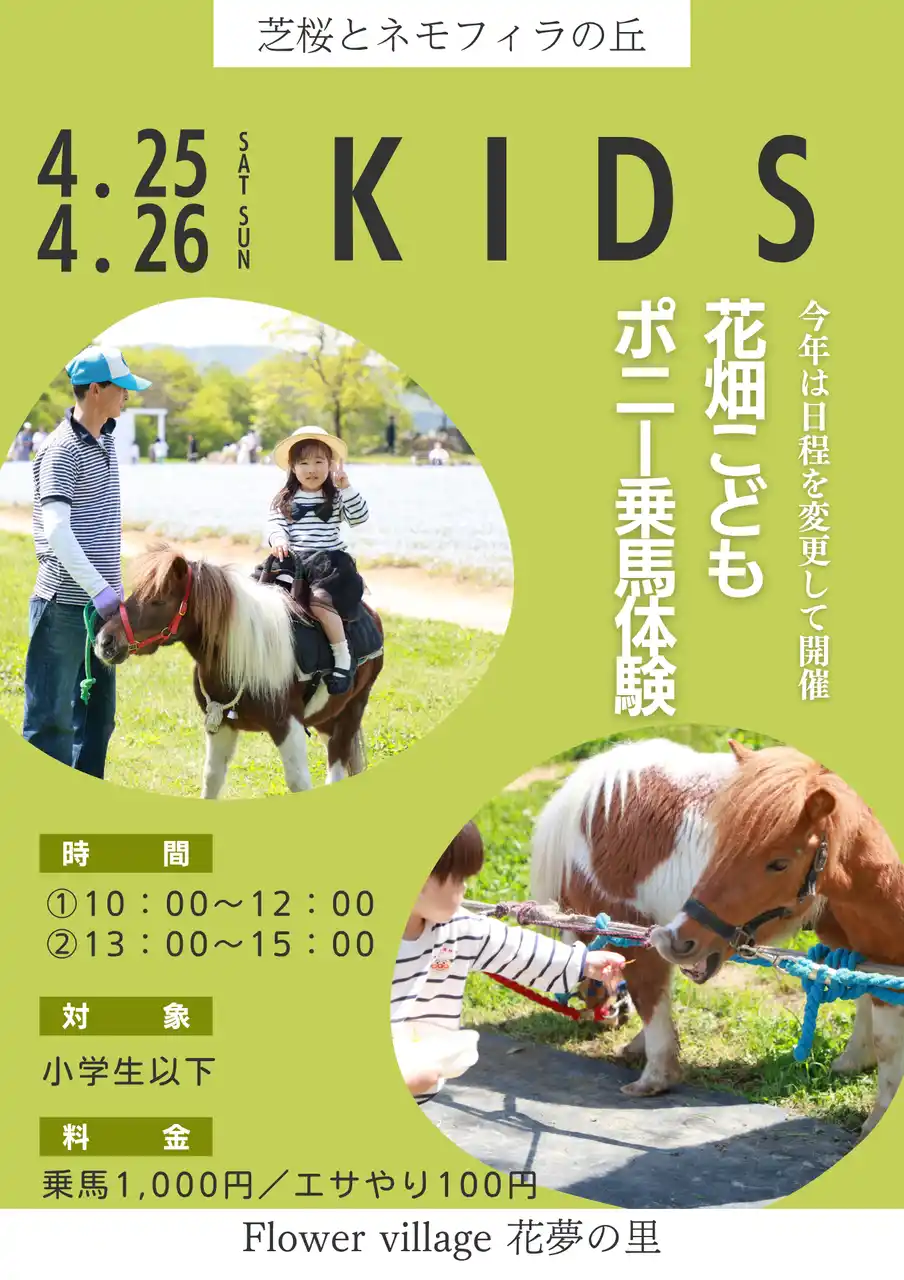 | Flower village 花夢の里では「芝桜とネモフィラの丘」を開催中です。ネモフィラ・芝桜が見頃を迎えています。そのほかにもユキヤナギ、菜の花も見頃です。色とりどりの春の花々を植栽した「春のパッチワーク」は咲き始め、芝桜はこれから咲いてくるところもありますので、まだまだゆっくりと花夢の里を楽しんでいただける状態です。皆様のお越しをお待ちしております。 | |||||||||||||||||||