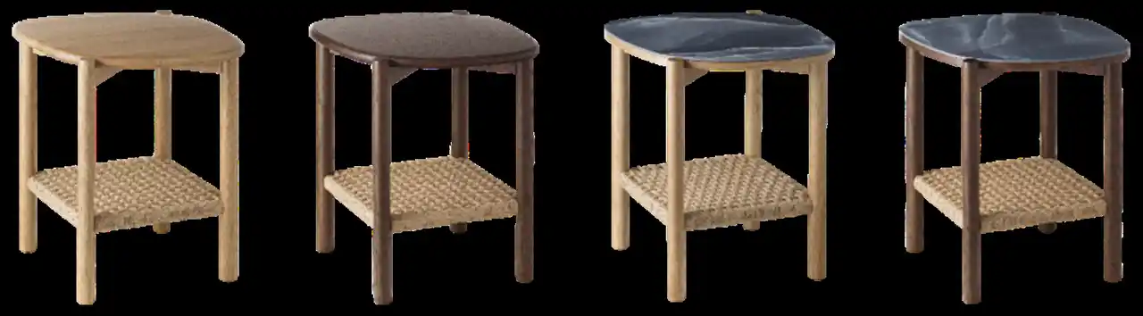 やわらかな形状の天板とラタン編みの棚板を備えたサイドテーブルは、温もりを感じさせる心地良さを生み出します。 |