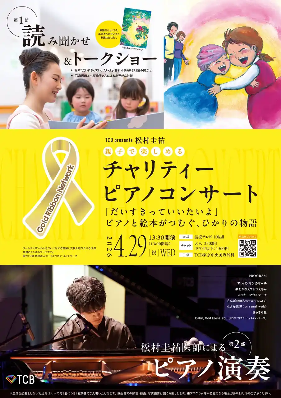 本コンサートは、小児がん啓発・支援への強い想いを込めて開催するチャリティー公演です。 元フライトドクターでありピアニストとしても活躍する松村圭祐医師のピアノ演奏と、絵本作家の小原絢子さんによる絵本の読み聞かせを中心に、小児がんについて多くの方に知っていただく啓発の場となることを願っております。 なお、チケット収益は小児がん支援活動「ゴールドリボン」の趣旨に沿った団体への寄付を予定しております。 皆様のご来場を心よりお待ちしております。 |