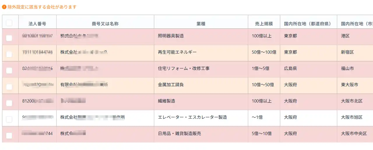 | リスト取得画面や保存済みリストにおいて、送信除外企業が赤色の背景で表示されるように | ||||||||||||