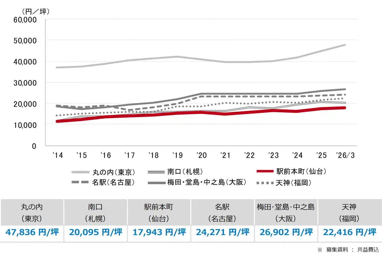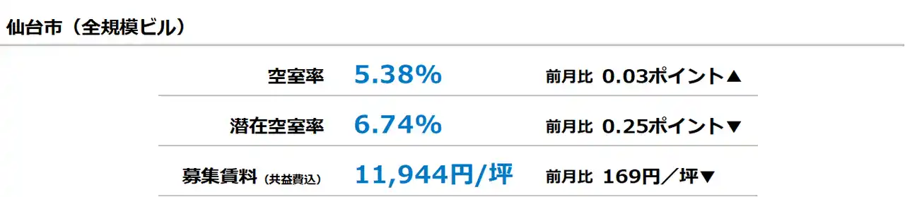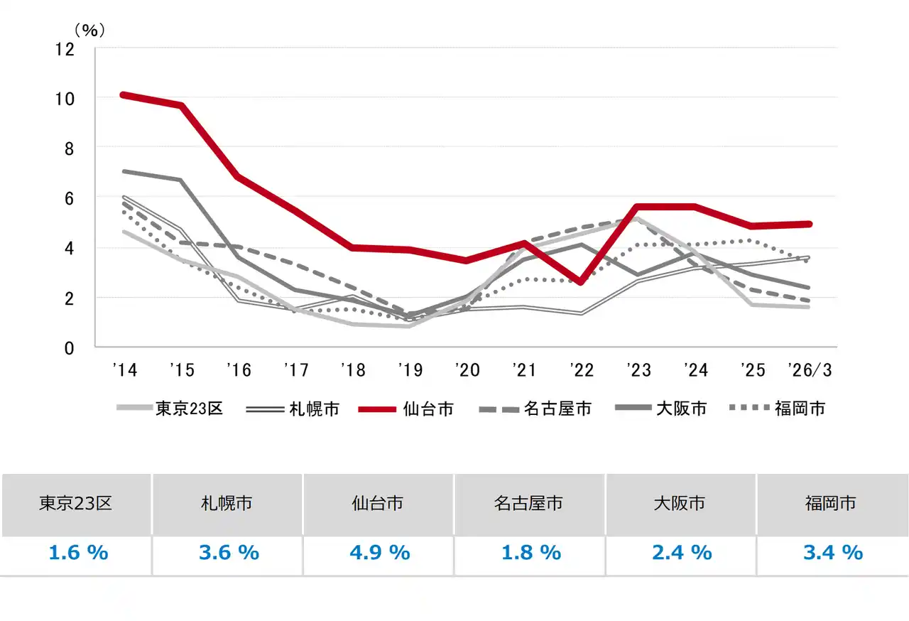 三幸エステート株式会社(本社:東京都中央区、取締役社長:福島正二郎)は、2026年3月度の仙台市オフィス賃貸状況(空室率&現空面積:全規模、募集賃料&募集面積:全規模、規模別空室率、主要エリア※1空室率:全規模)および全国6大都市(東京・札幌・仙台・名古屋・大阪・福岡)の大規模ビルのマーケットデータをまとめた「オフィスマーケット2026年4月号仙台」を公表します。 |