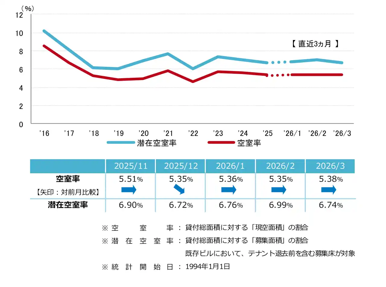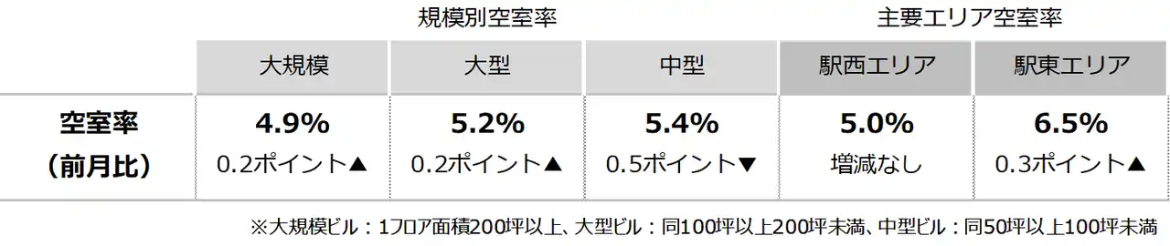 空室率は前月比プラス0.03ポイントの5.38%となり、前月からほぼ横ばいだった。部分解約や集約移転等で空室が生じた一方、館内増床等で空室消化が進み、わずかな動きに止まっている。規模別では「中型」が前月比マイナス0.5ポイントの大幅な低下となった。潜在空室率は前月比マイナス0.25ポイントの6.74%だった。 |