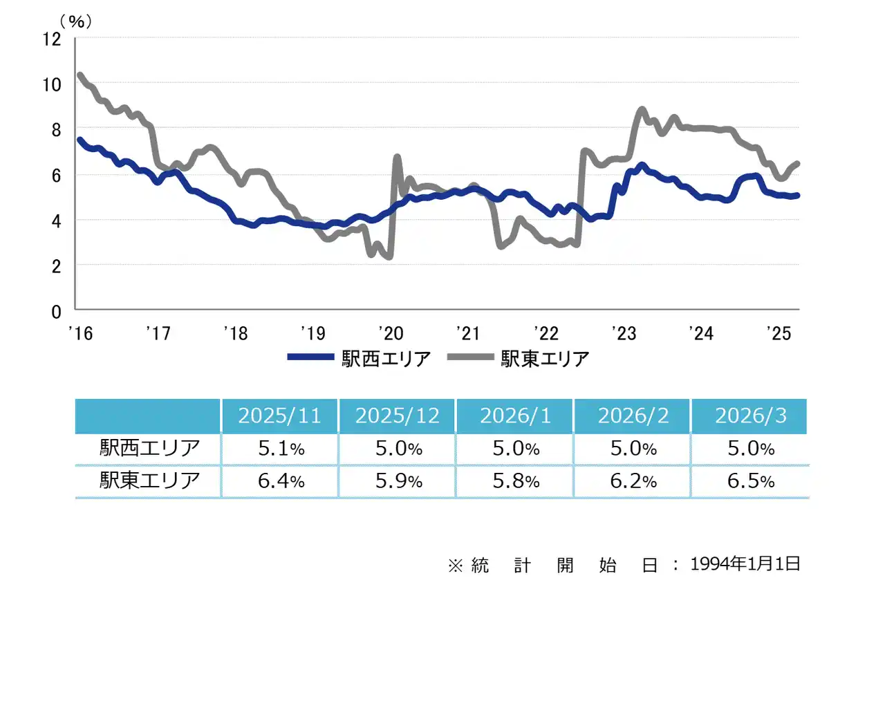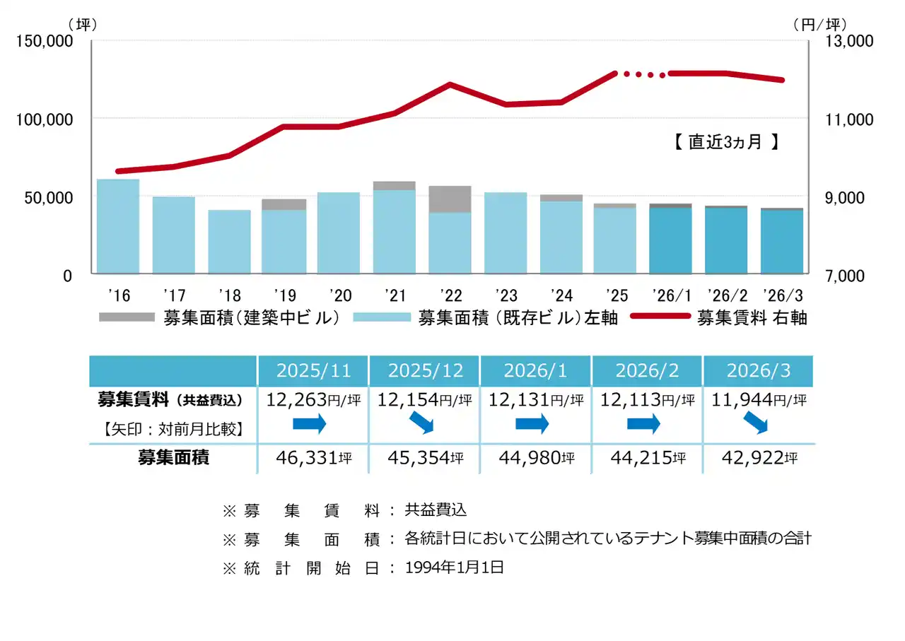 募集賃料は前月比マイナス169円/坪の11,944円/坪となった。4ヵ月連続で小幅に下落したが、大手オーナーを中心に募集条件を引き上げる動きが広がっている。 |