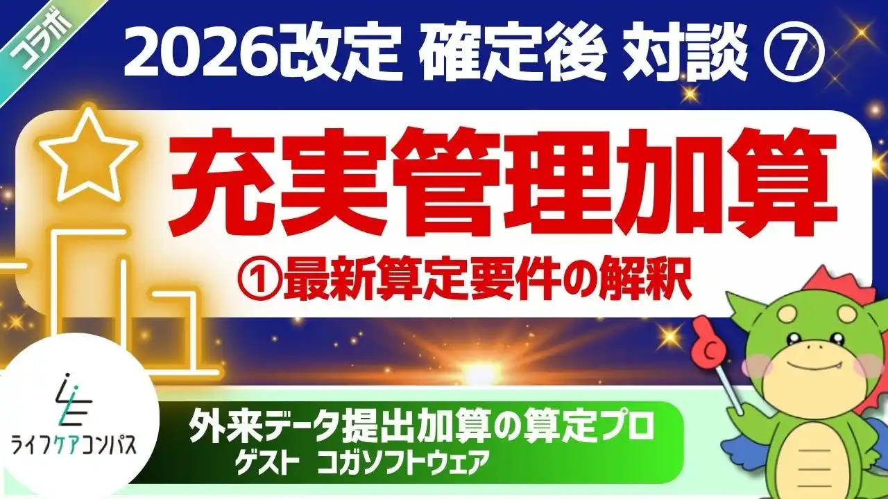 コガソフトウェア株式会社(本社:東京都台東区、代表取締役:古賀 詳二)は、複雑な診療報酬制度の分かりやすい解説で全国の医療従事者から圧倒的な支持を得ているYouTube『診療報酬りゅうチャンネル』とコラボ。2026年度(令和8年度)診療報酬改定の目玉である新設項目「充実管理加算」の攻略法を徹底解説するコラボ動画・第1弾を公開したことをお知らせいたします。 |