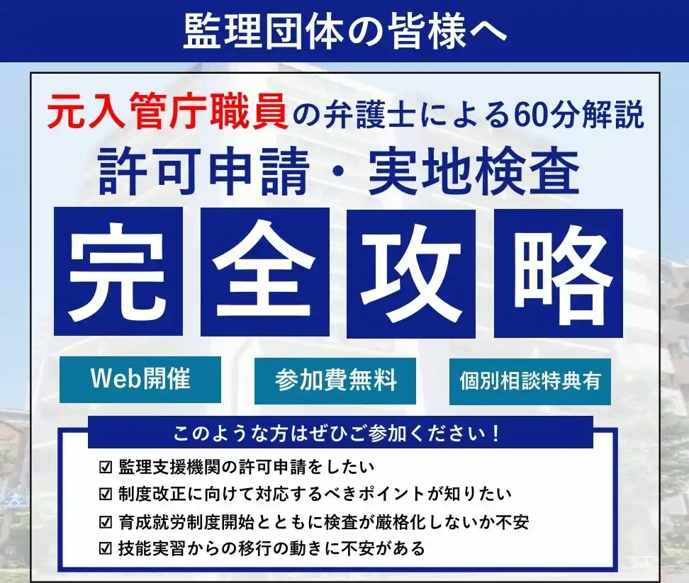 武蔵小杉あおば法律事務所は、全国の監理団体の皆様を対象に、無料Webセミナー「許可申請・実地検査 完全攻略」を開催いたします。本セミナーは、元入管庁職員の弁護士が登壇し、監理支援機関の許可申請や、実地検査・行政指導への対応について、各回60分で実務上のポイントをわかりやすく解説するものです。開催形式はWeb、参加費は無料です。 |