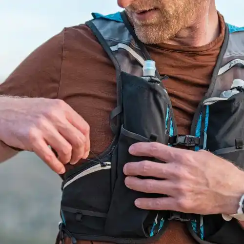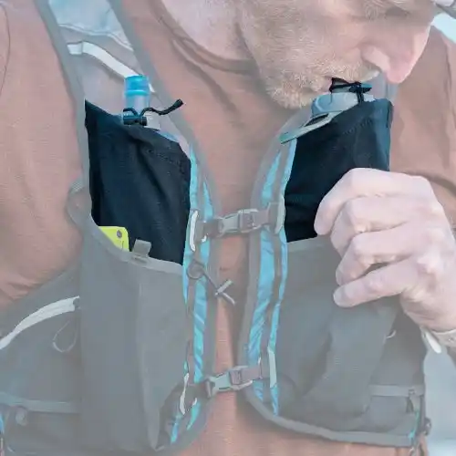 アクセス性の高い本体前面に複数のポケットを装備。補給食やスマートフォンやライト、ホイッスル、ソフトフラスクなど、必要なアイテムに素早くアクセスできます。パフォーマンス精度を高めるために極限まで無駄をそぎ落とし、より軽快な携行を実現しました。 |