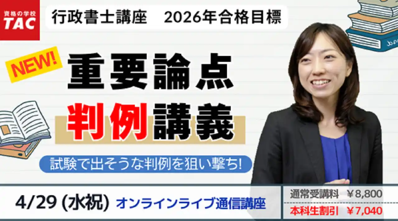 行政書士試験対策講座を展開しているTAC株式会社(東京都千代田区)は、2026年合格目標で学習中の方を対象に、今年度の行政書士試験で狙われそうな判例をピックアップして解説する『重要論点判例講義』(全2回)を4/29(水祝)にオンラインライブで新規開講します。 |
