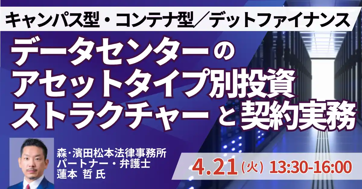JPI(日本計画研究所)は、森・濱田松本法律事務所 パートナー・弁護士 蓮本 哲 氏を招聘し、データセンターのアセットタイプ別投資ストラクチャーと契約実務について詳説いただくセミナーを開催します。 |