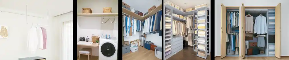 | ウォークインクローゼットは、天棚とハンガーパイプで構成したシンプルなタイプと、さらに収納棚と引き出しを充実させたタイプをご用意しております。人気のシステムクローゼットでは、奥行きを有効活用する「スライドハンガー」や、上下2段式で収納できる「ダブルハンガー」、「小物入れ」「衣装ケース」などが備わっており、ハンガーにたっぷり衣服をかけられるので、たたむ手間も少なく、衣替えの手間も軽減。廊下や洗面脱衣室に併設し、ご家族共用の収納として使用する方も多くいらっしゃいます。 | |||||||||
