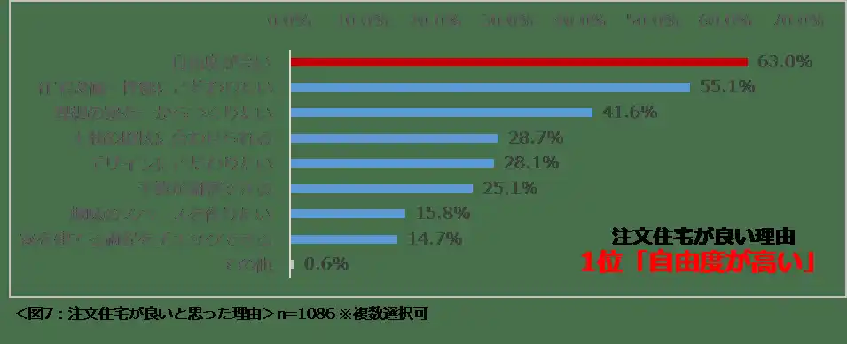| 戸建て住宅を購入する際に「注文住宅」を希望すると回答した1086名にその理由について尋ねたところ、「自由度が高い」という回答が最も多く63.0%という結果になりました。(図7) | |||||||||
