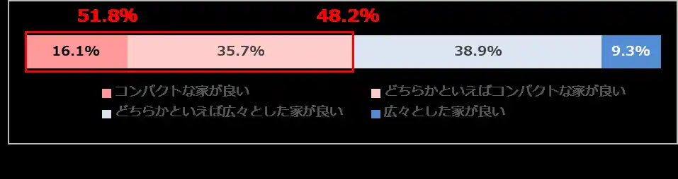 | これから家を建てるなら、「コンパクトな家」派が51.8%、「広々とした家」派が48.2%とほぼ同数に。 | |||||||||